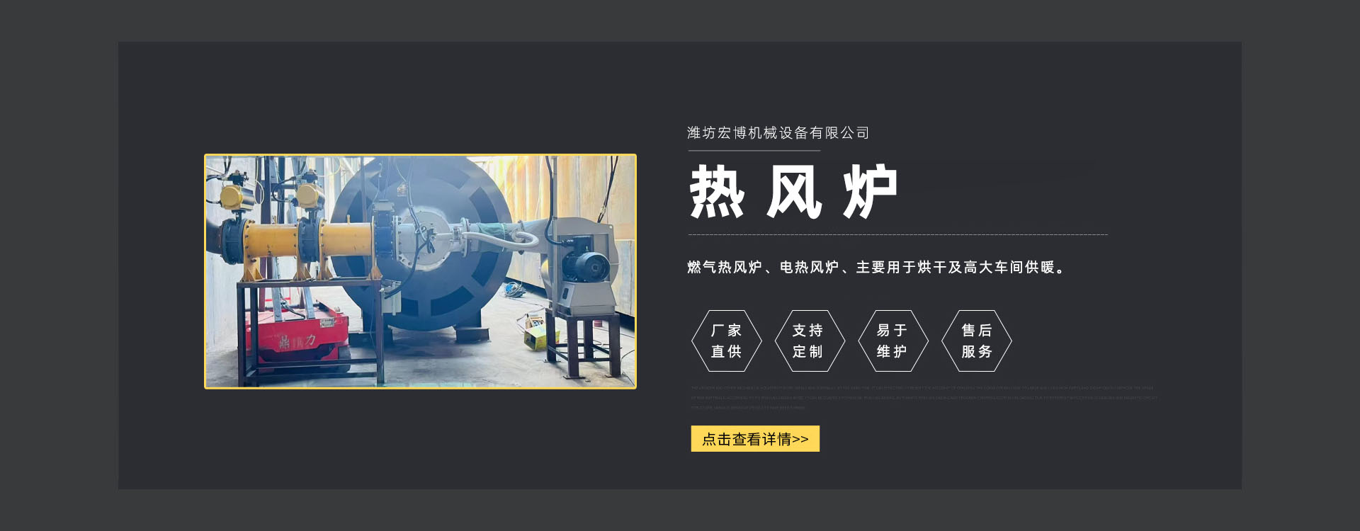 宏博公司主要產(chǎn)品有:網(wǎng)帶烘干機(jī)、食品烘干機(jī)、滾筒烘干機(jī)、隧道窯、烘干箱、燃?xì)鉄犸L(fēng)爐、高大車(chē)間供暖設(shè)備、礦用防爆電加熱器等。